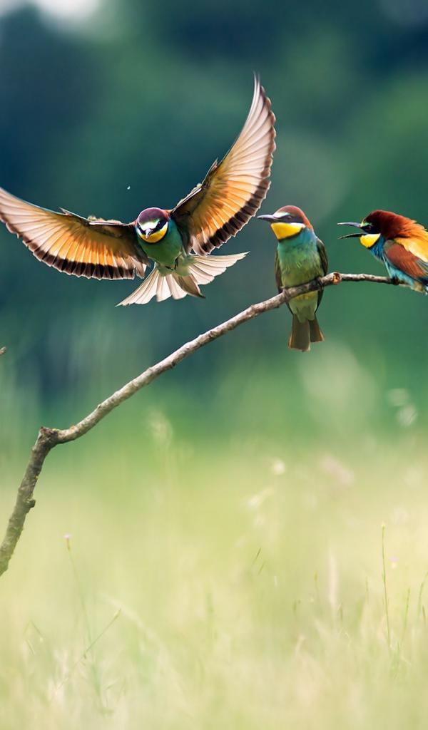 Wallpaper Three colorful bee-eater on a branch in the field