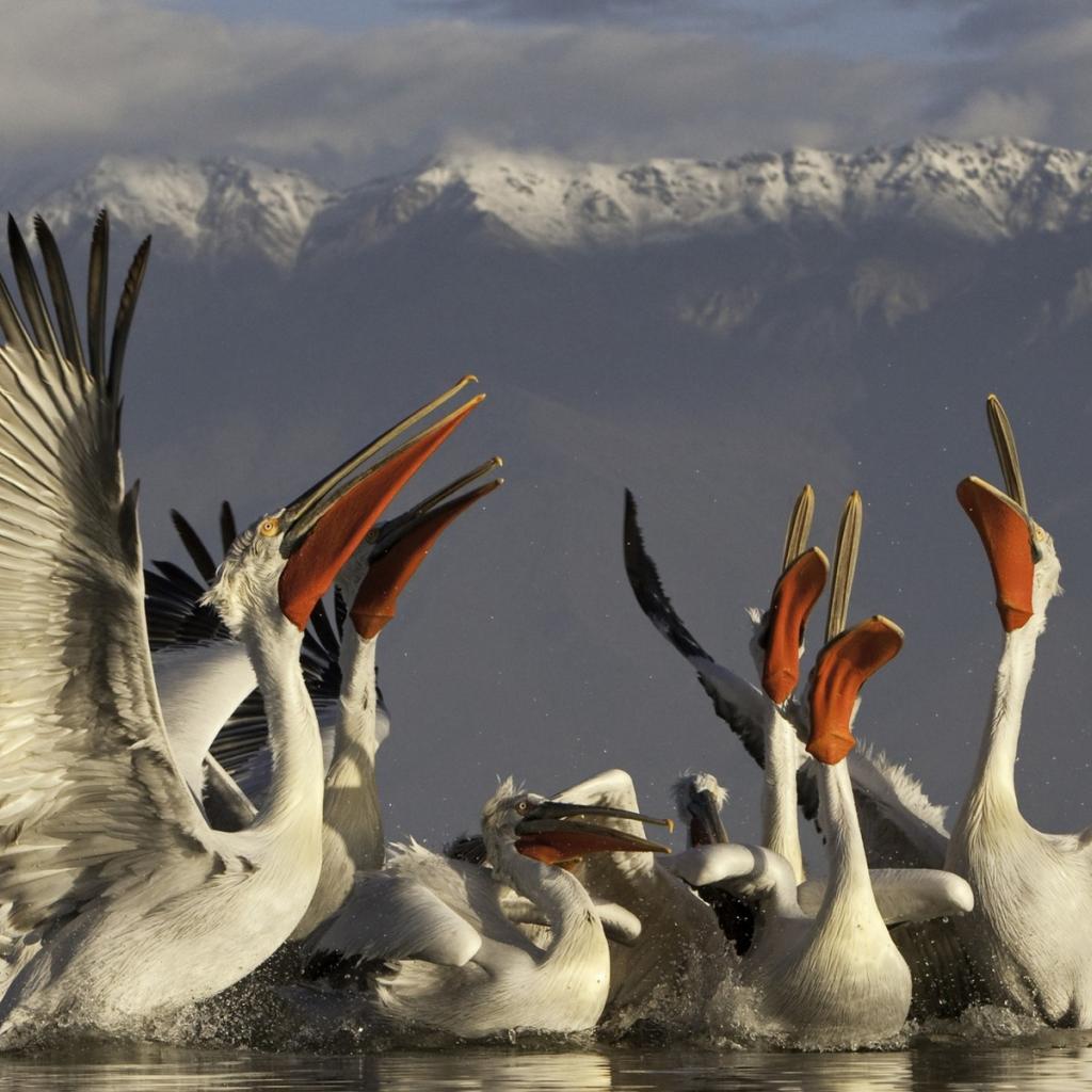 Wallpaper A flock of pelicans on a background of mountains