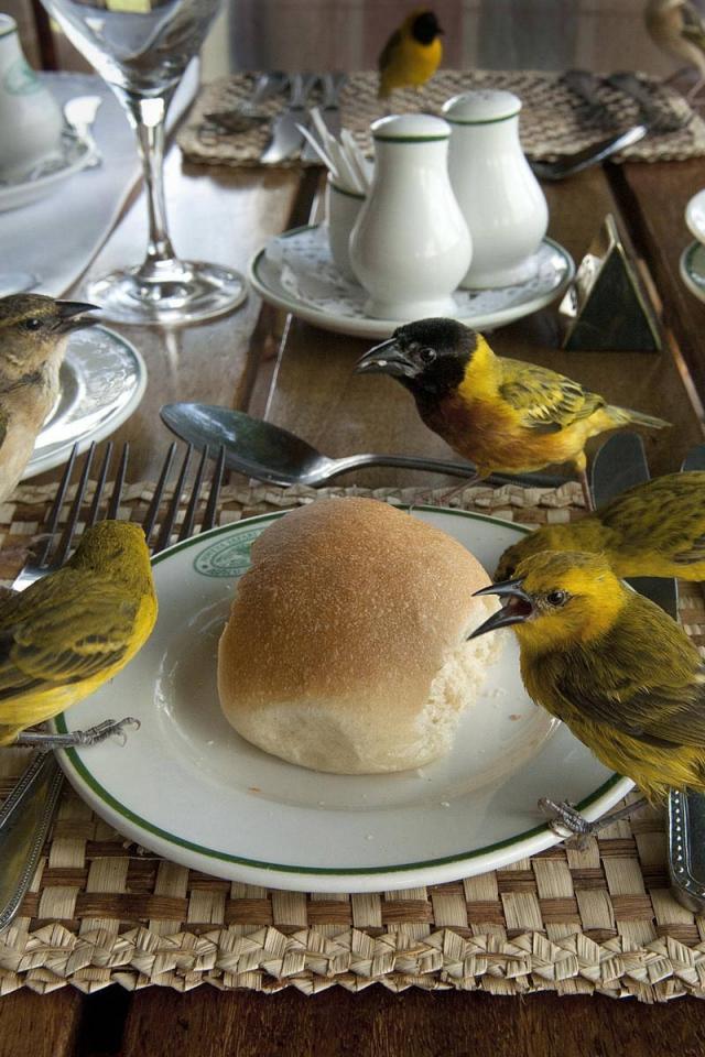 Wallpaper Birds peck bread on the table