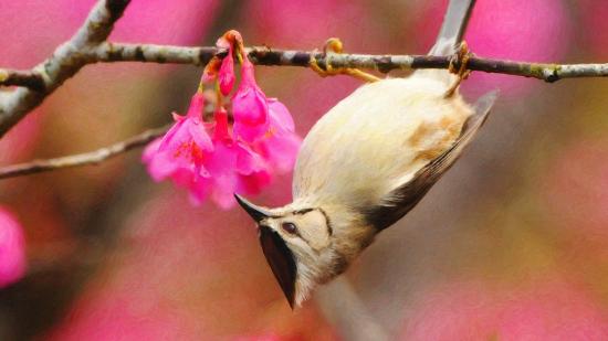 Wallpaper Bird on a branch hanging upside down