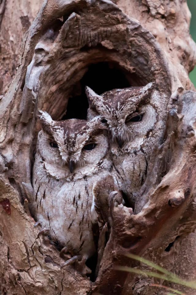 Wallpaper A pair of owls sitting next to a hollow