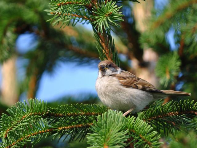 » Wallpaper Sparrow on a fir branch