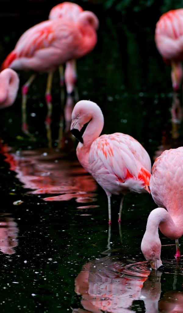 Wallpaper Flamingos feed on the lake
