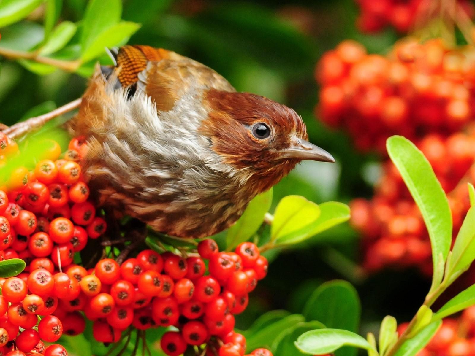 Wallpaper Bird regales red berries on the branch