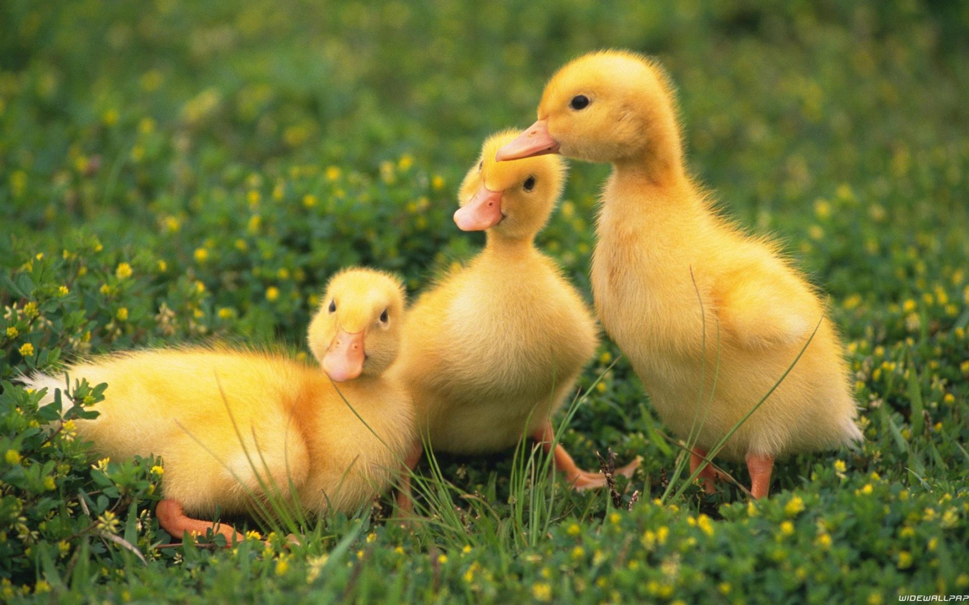 Wallpaper Three duckling on green lawn