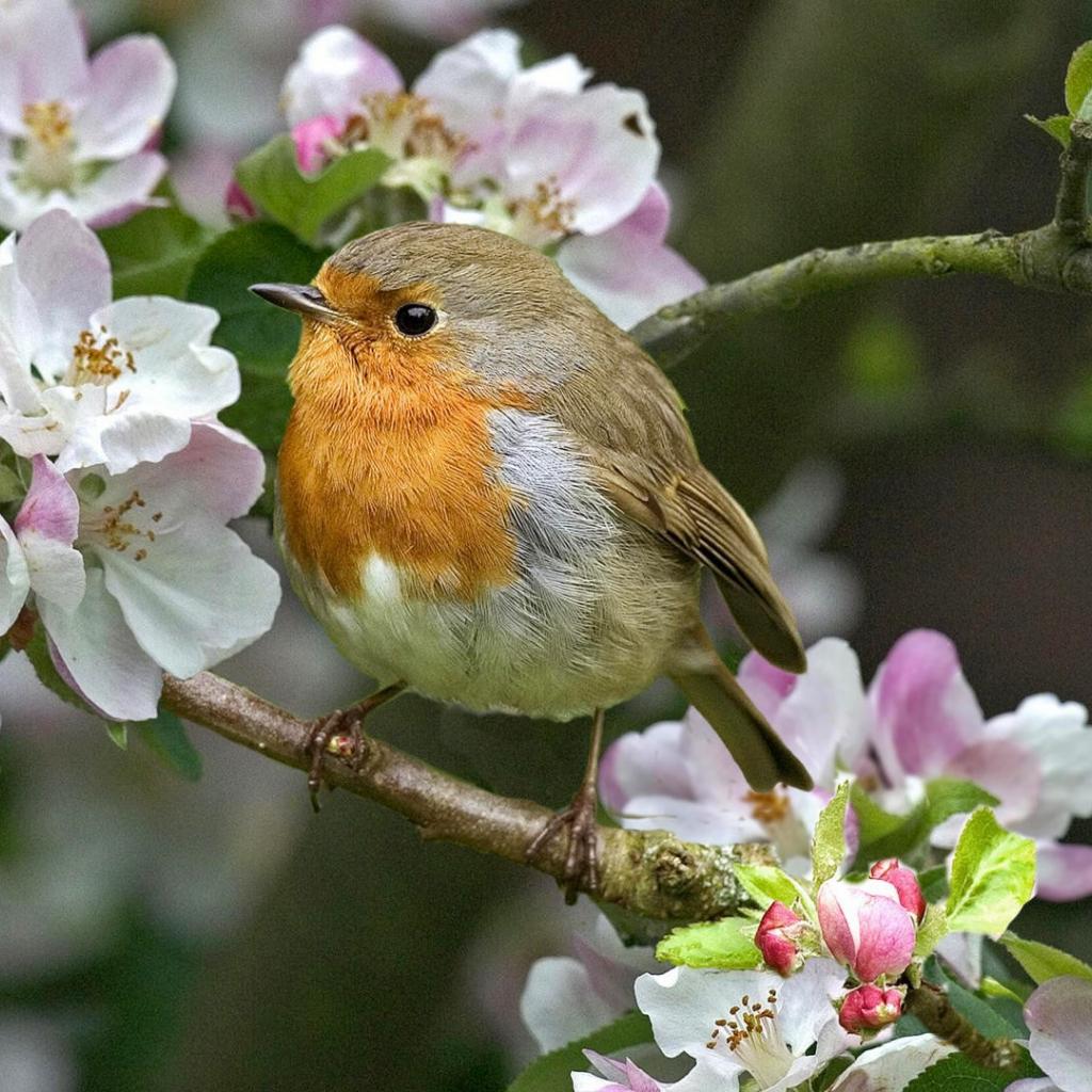 Wallpaper Robin on a flowering branch