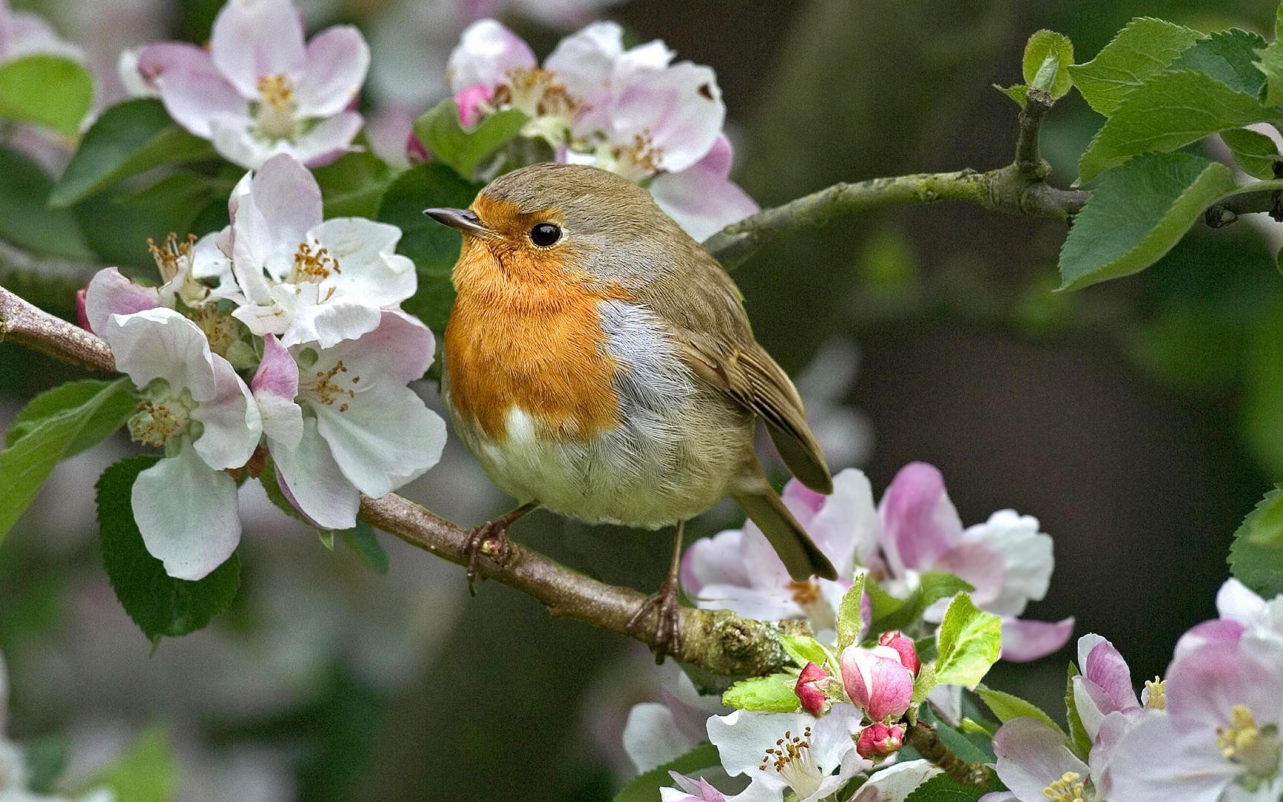 Wallpaper Robin on a flowering branch