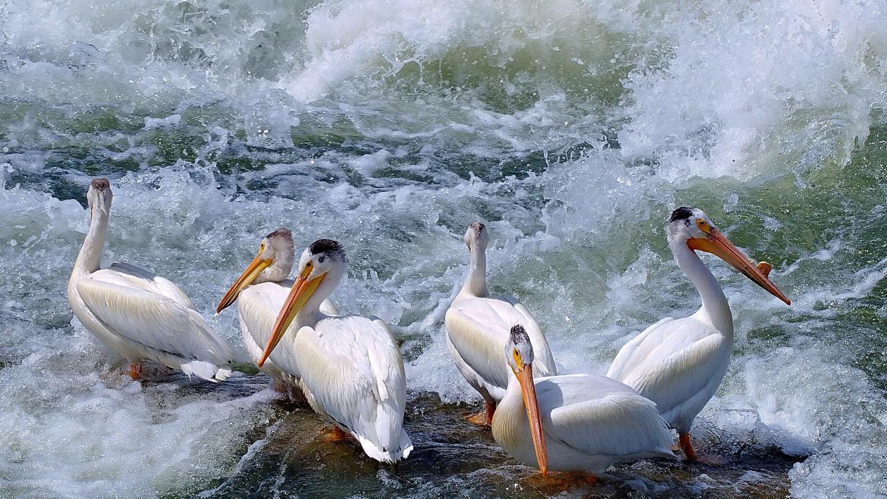 Wallpaper Pelicans among the waves