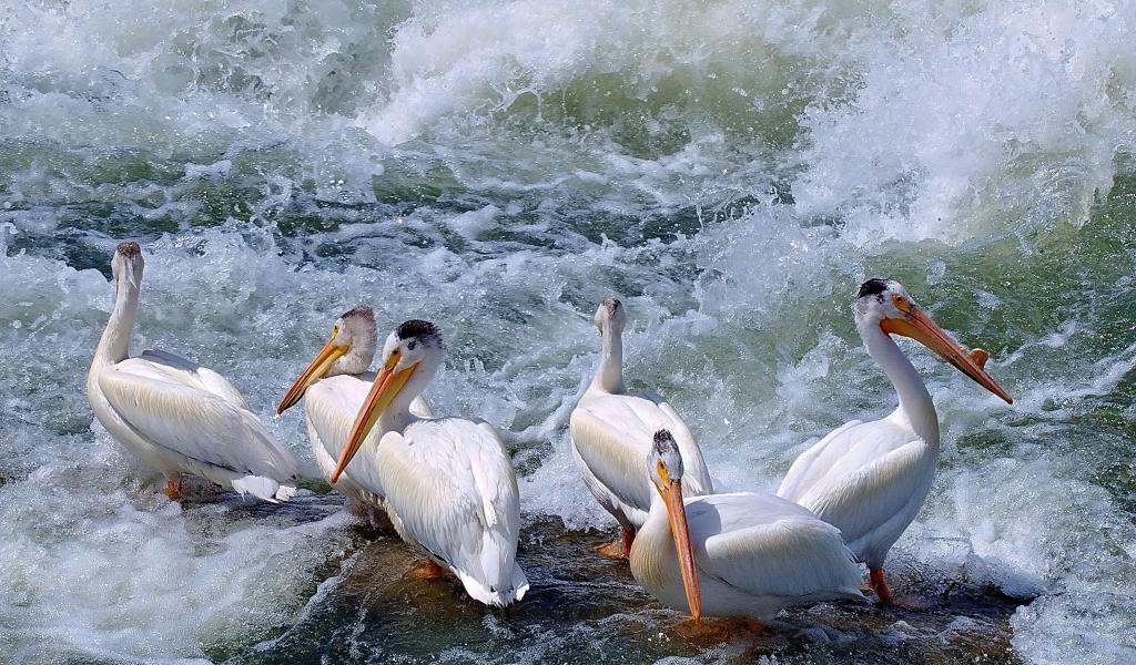Wallpaper Pelicans among the waves