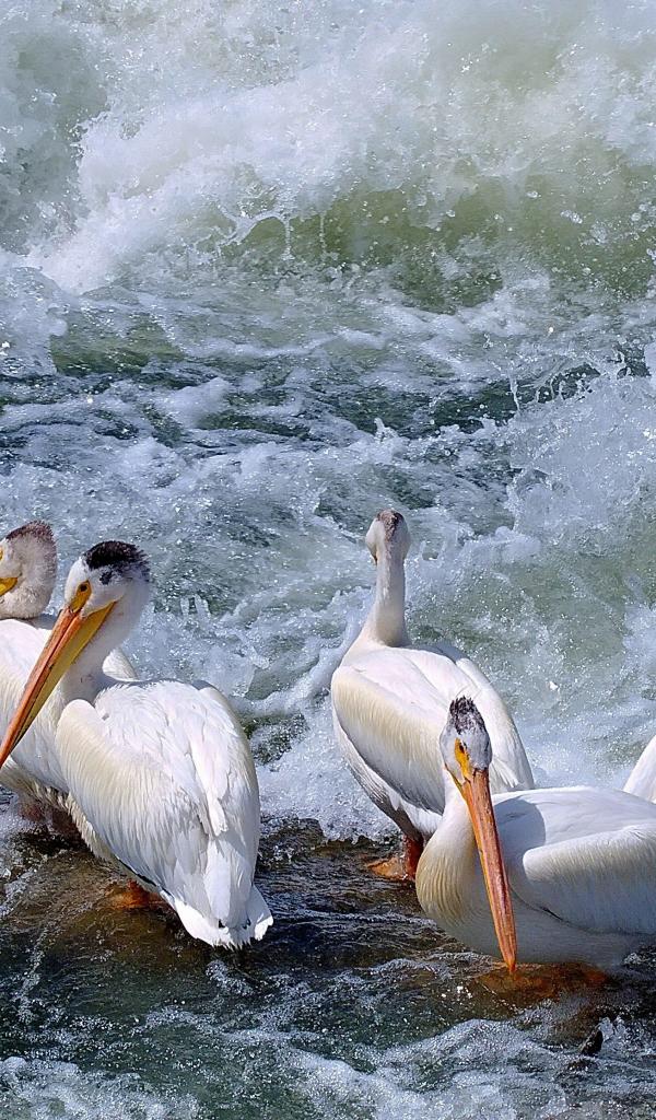Wallpaper Pelicans among the waves