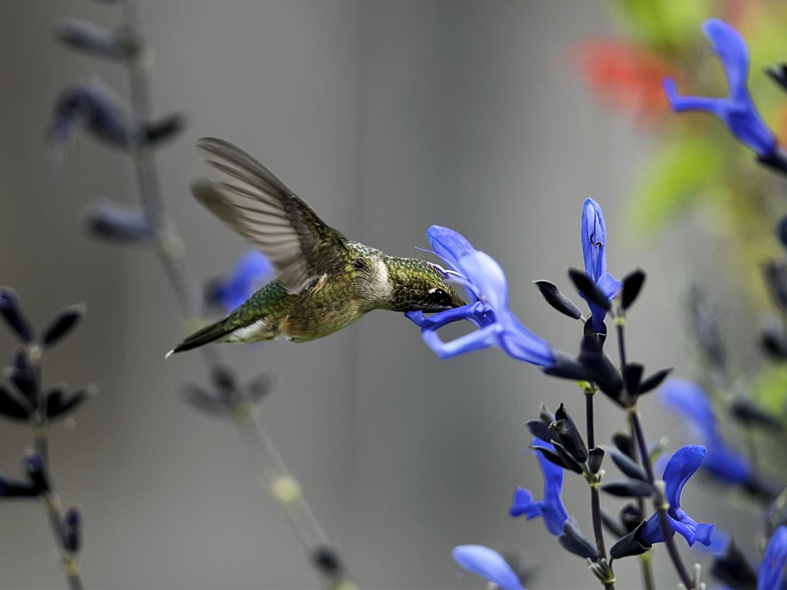 Wallpaper Hummingbirds around blue flower