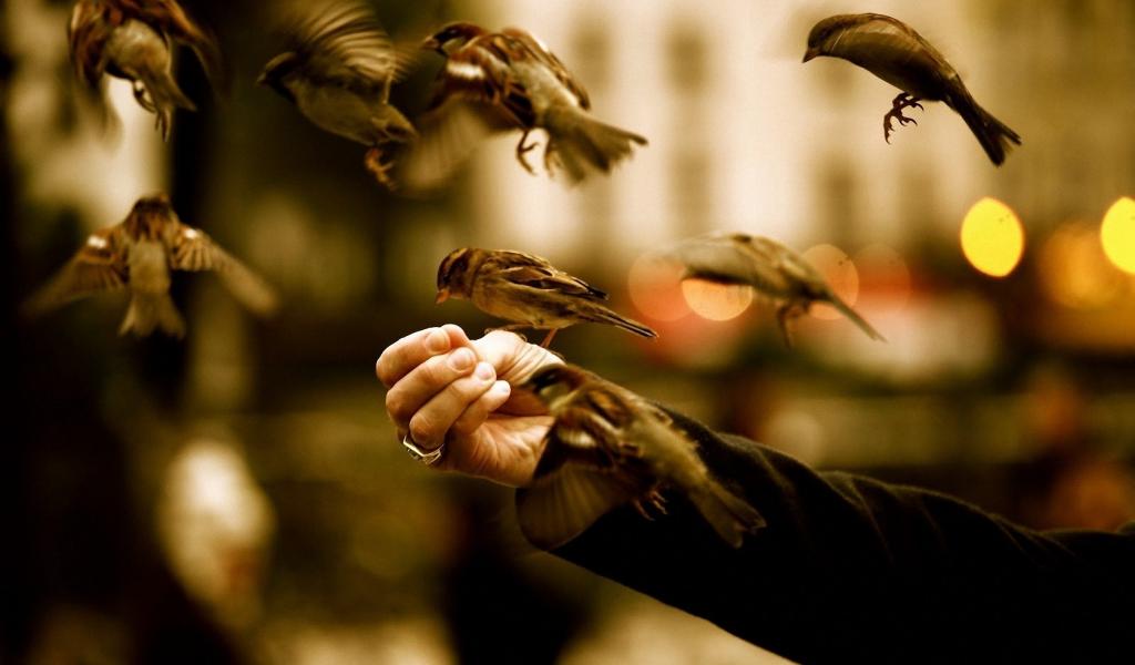 Wallpaper Birds eat with hands