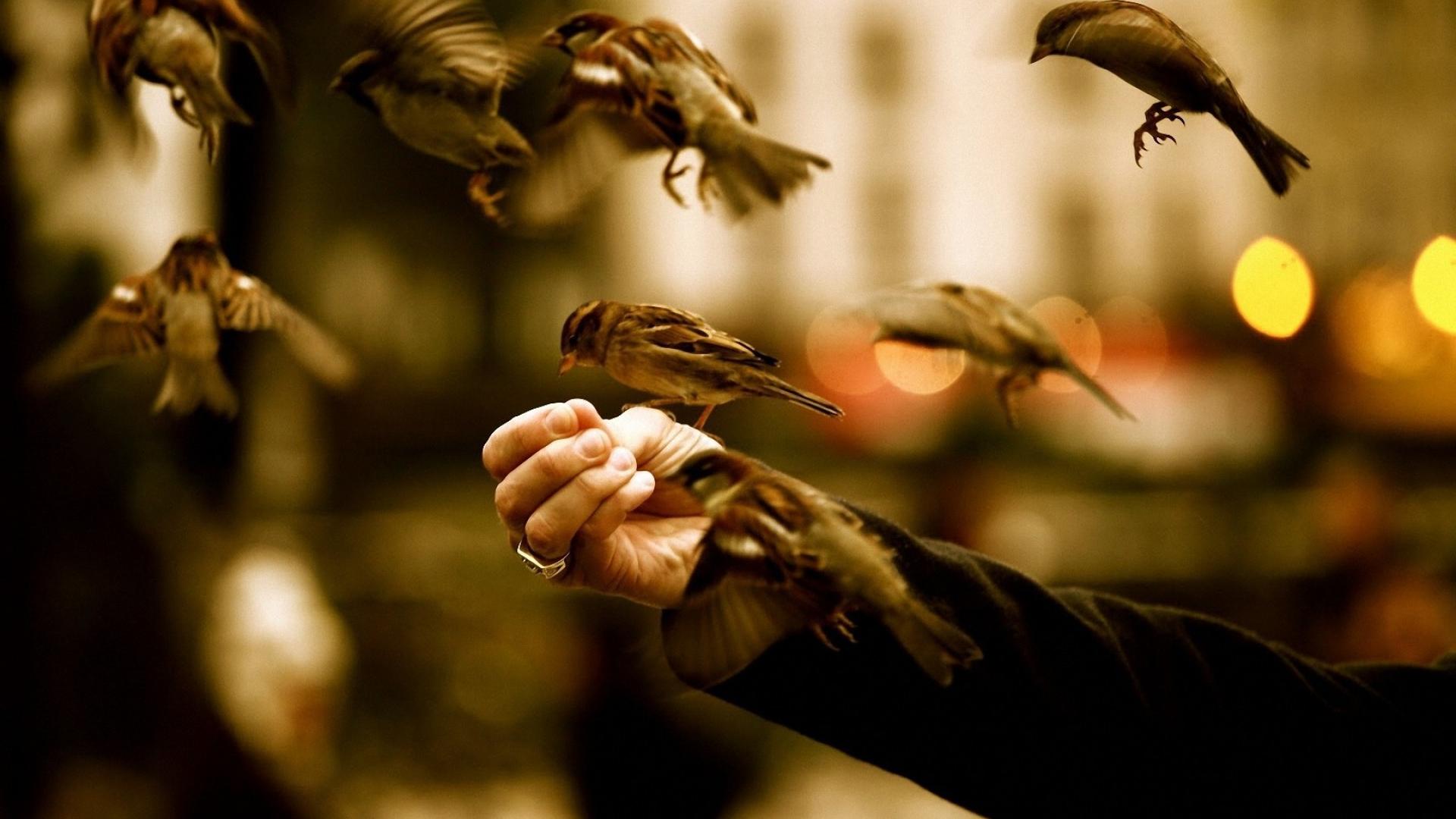 Wallpaper Birds eat with hands