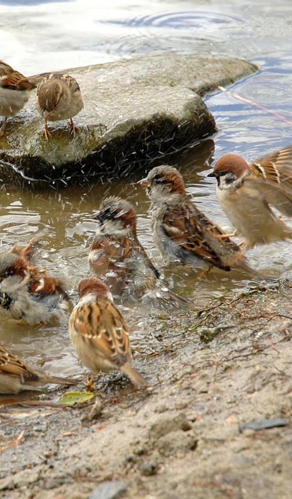Wallpaper Sparrows bathe