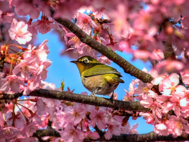 Wallpaper Birdie in an Oriental cherry