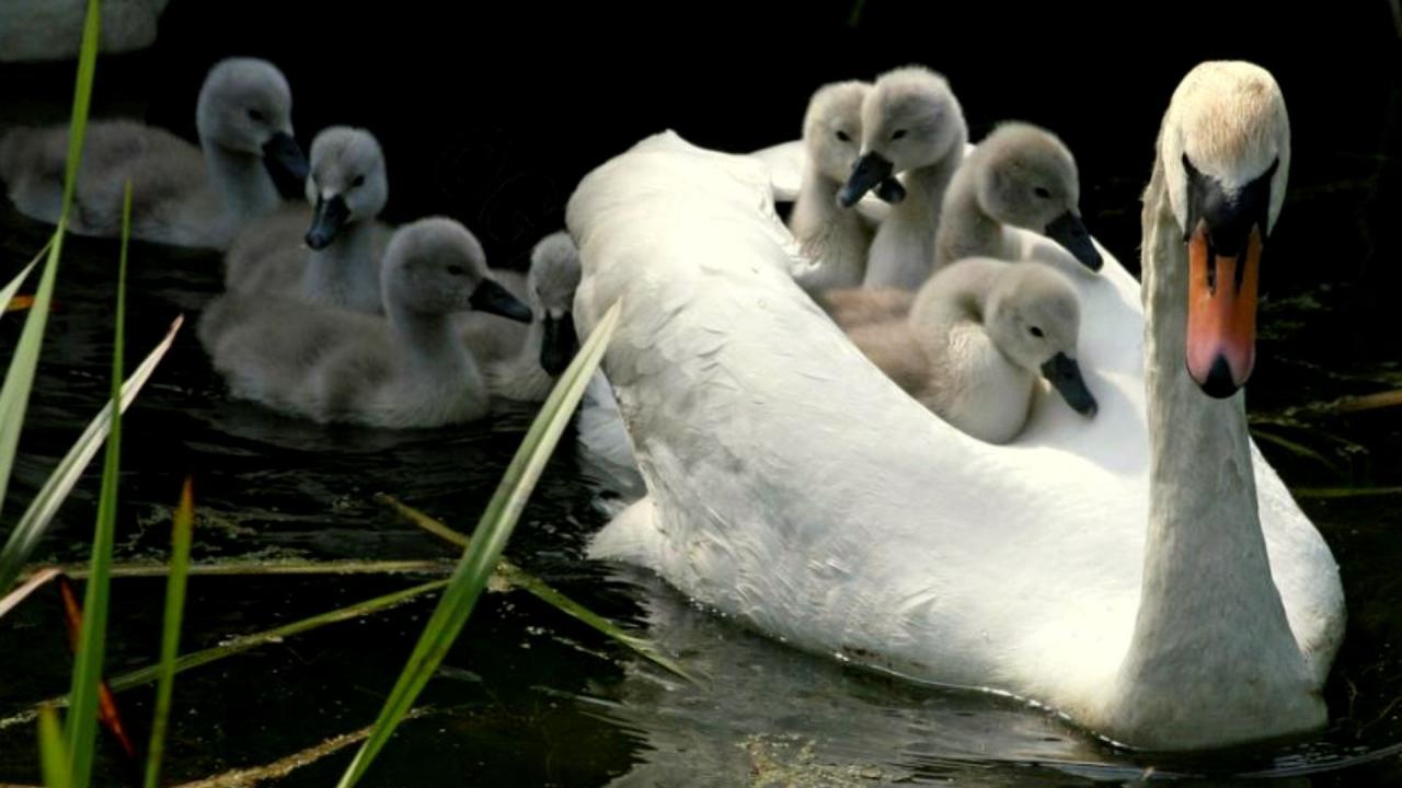 Wallpaper Mama swan with children