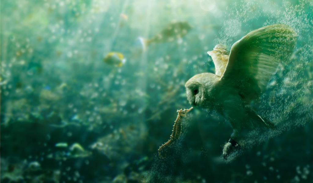 Wallpaper Owl and seahorse under water