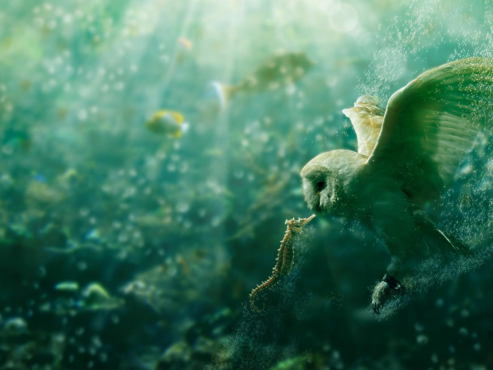 Wallpaper Owl and seahorse under water
