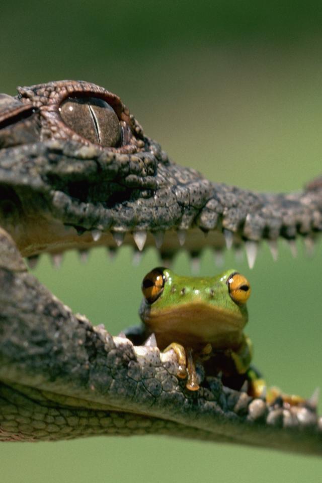 Wallpaper A frog sitting in the jaws of a crocodile