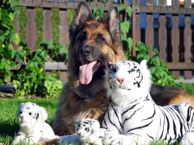 Wallpaper German Shepherd Dog with toy tiger