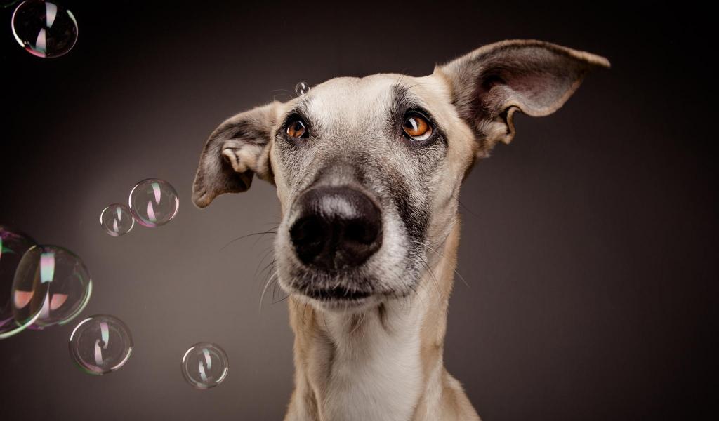 Wallpaper Confused dog among soap bubbles