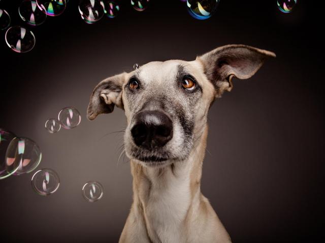 Wallpaper Confused dog among soap bubbles