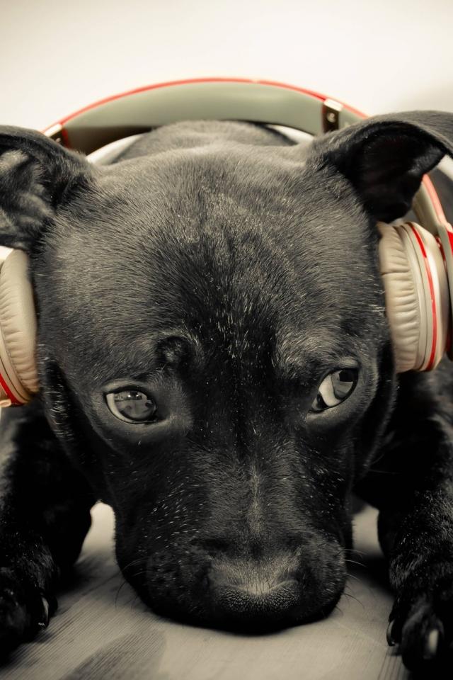 Wallpaper Sad black puppy wearing headphones