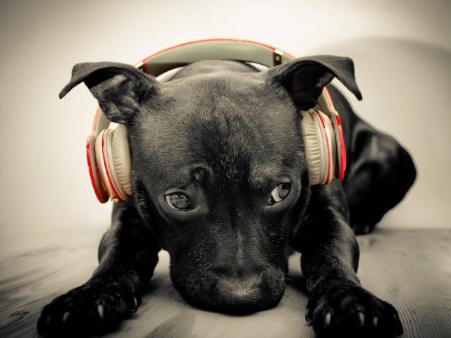 Wallpaper Sad black puppy wearing headphones