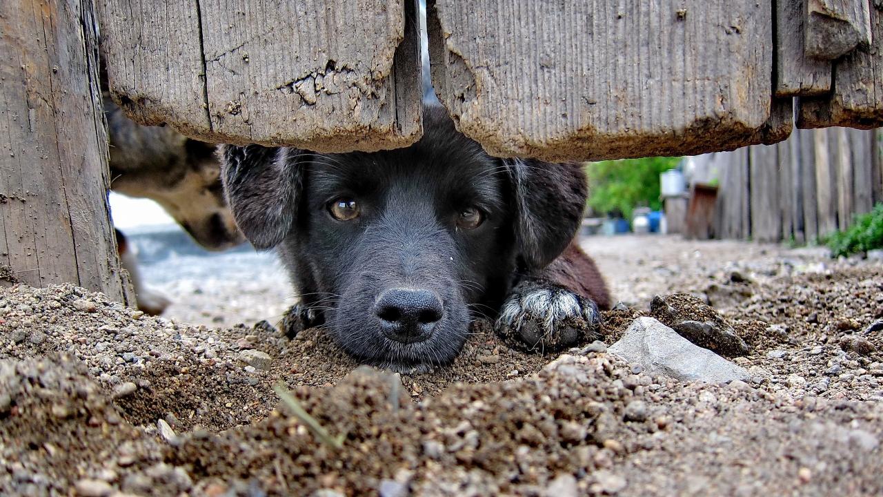 Wallpaper Black dog behind a fence