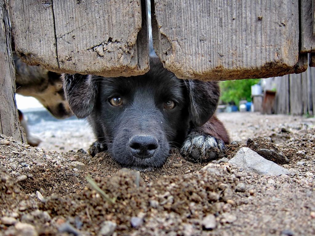 Wallpaper Black dog behind a fence