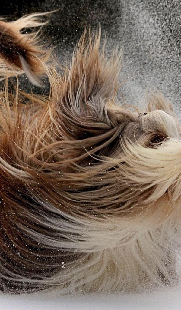 Wallpaper Happy dog with long hair playing in the snow