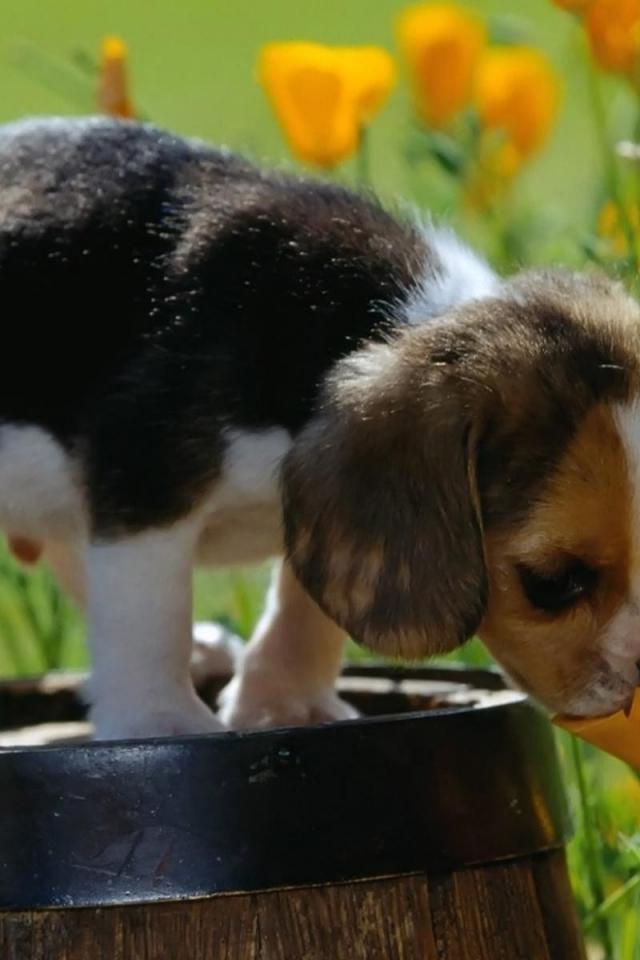 Wallpaper Puppy standing on a barrel