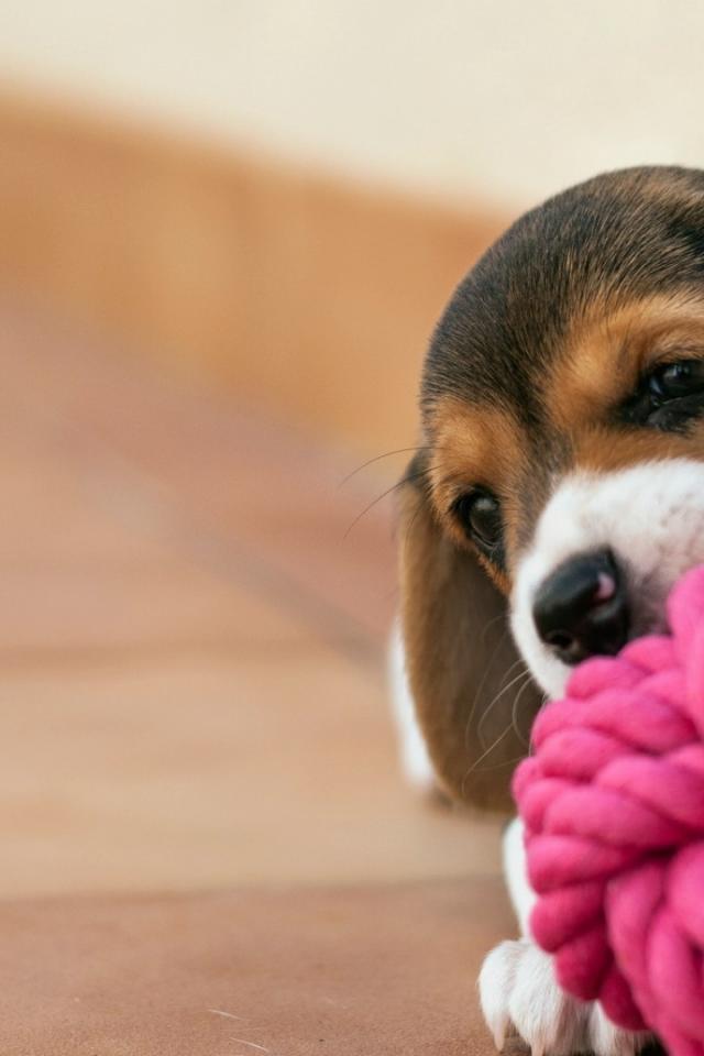 Wallpaper Puppy chewing on a tangle of red rope