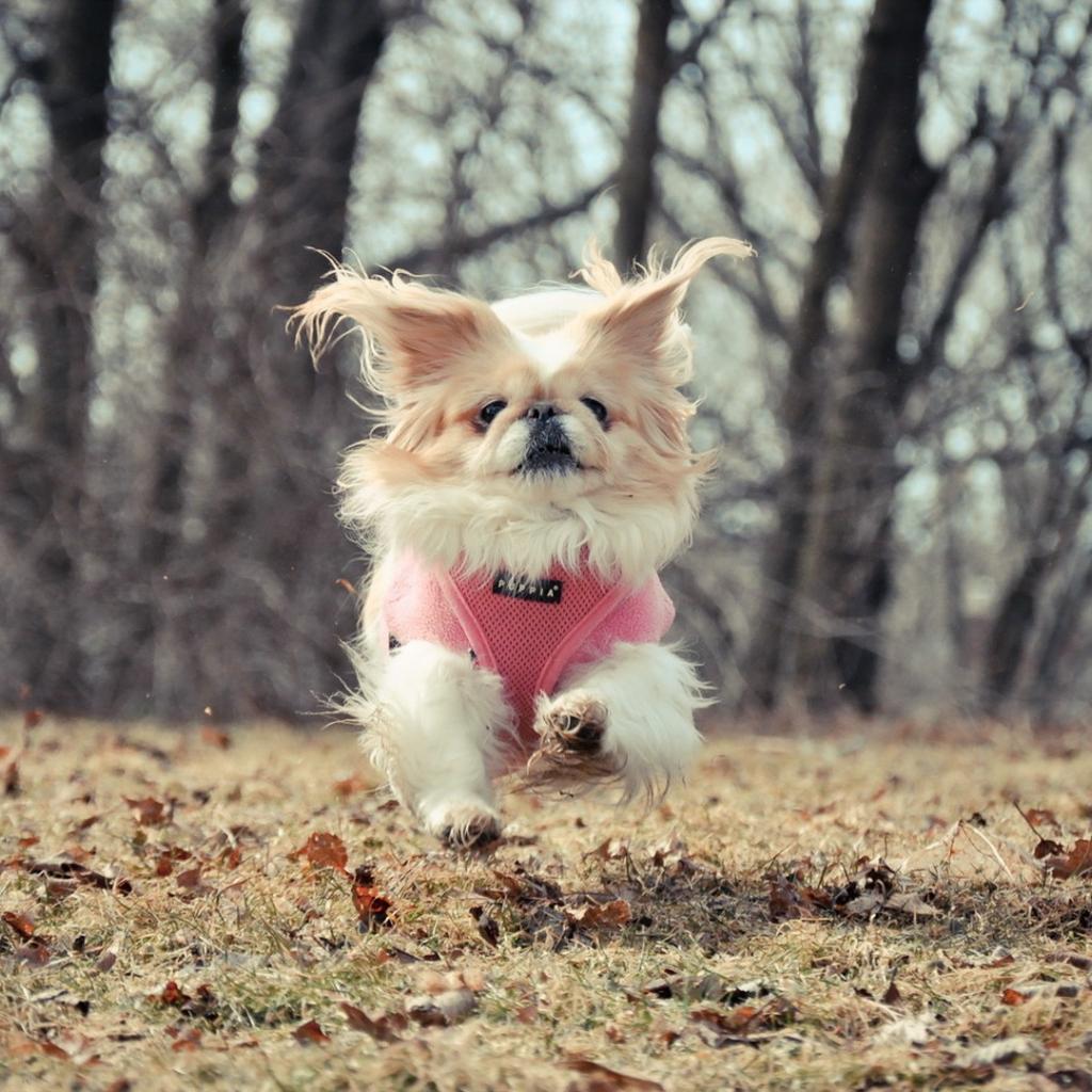Wallpaper Little dog running on fallen leaves