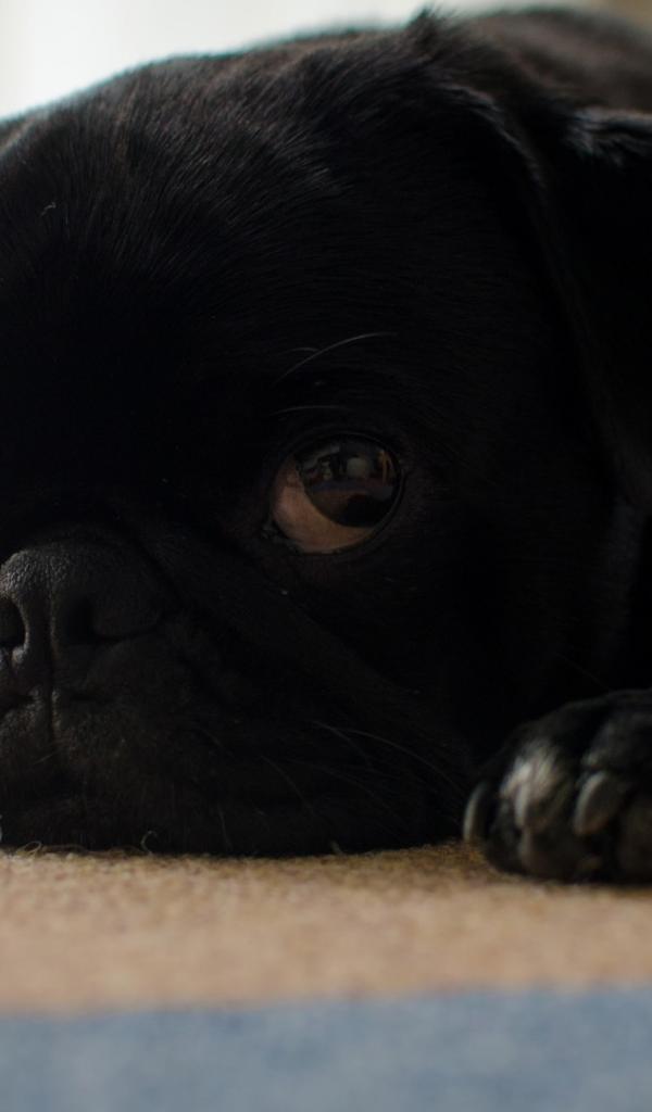 Wallpaper Black pug puppy sad lying on the floor
