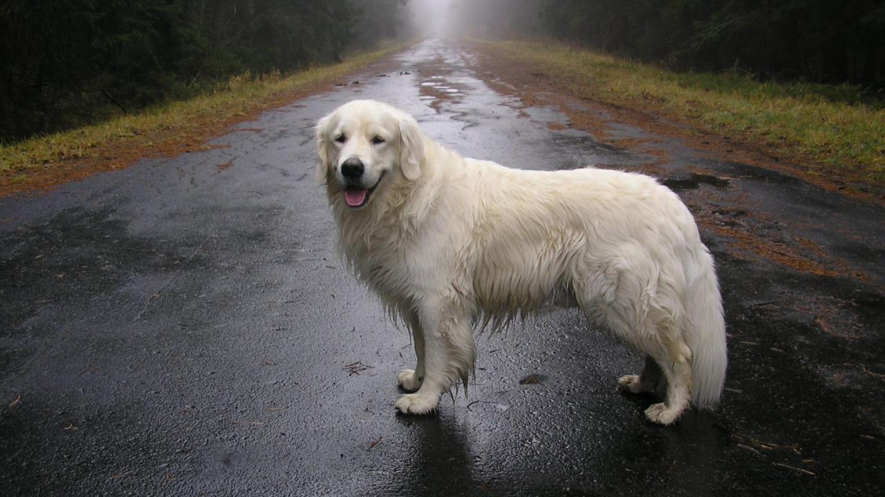 Wallpaper The dog is standing on a wet road
