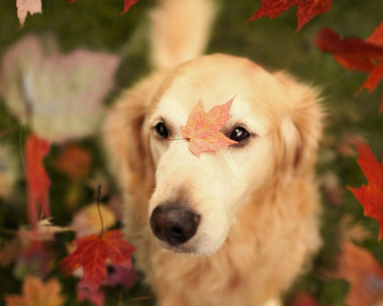 Wallpaper Dog with autumn leaves