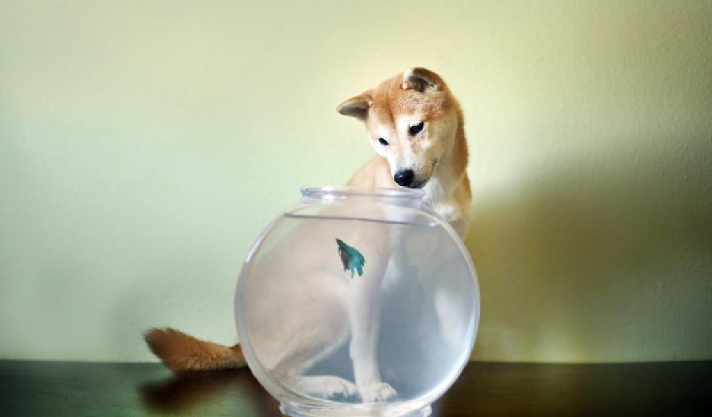 Wallpaper The dog looks at the fish