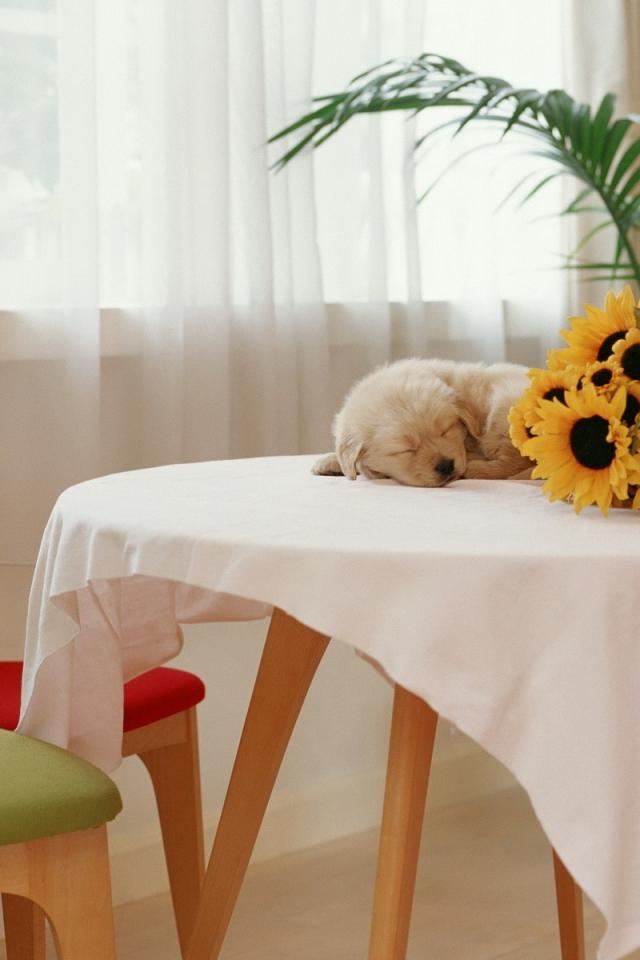 Wallpaper The puppy is sleeping on the table
