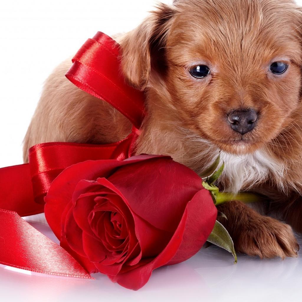 Wallpaper Puppy with a bow and a rose