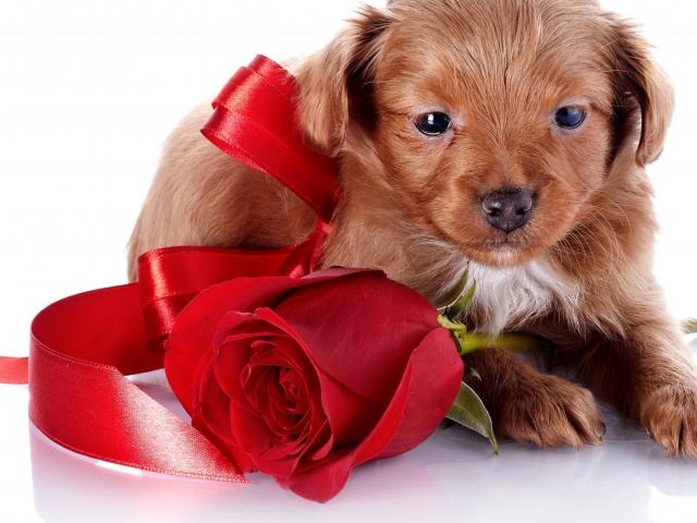 Wallpaper Puppy with a bow and a rose