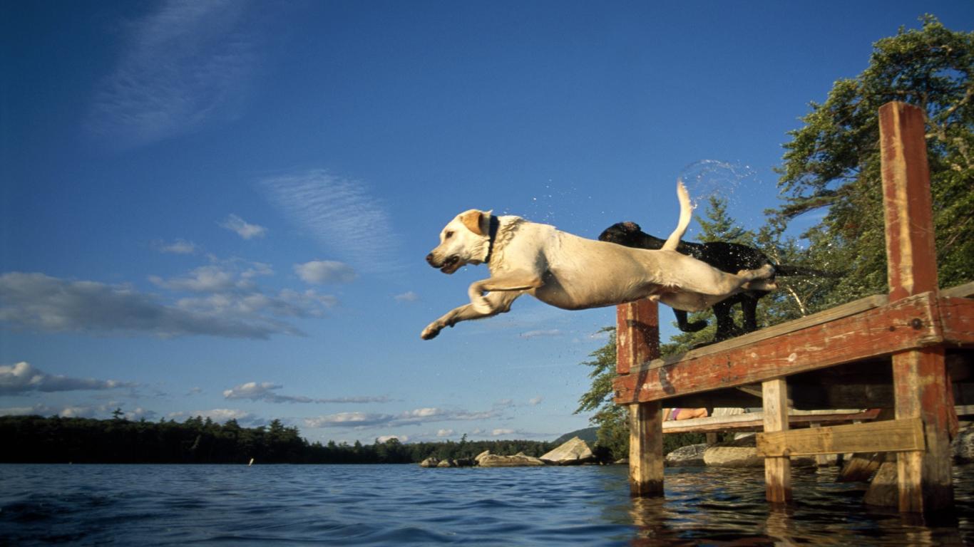 Wallpaper Dogs jump into the water