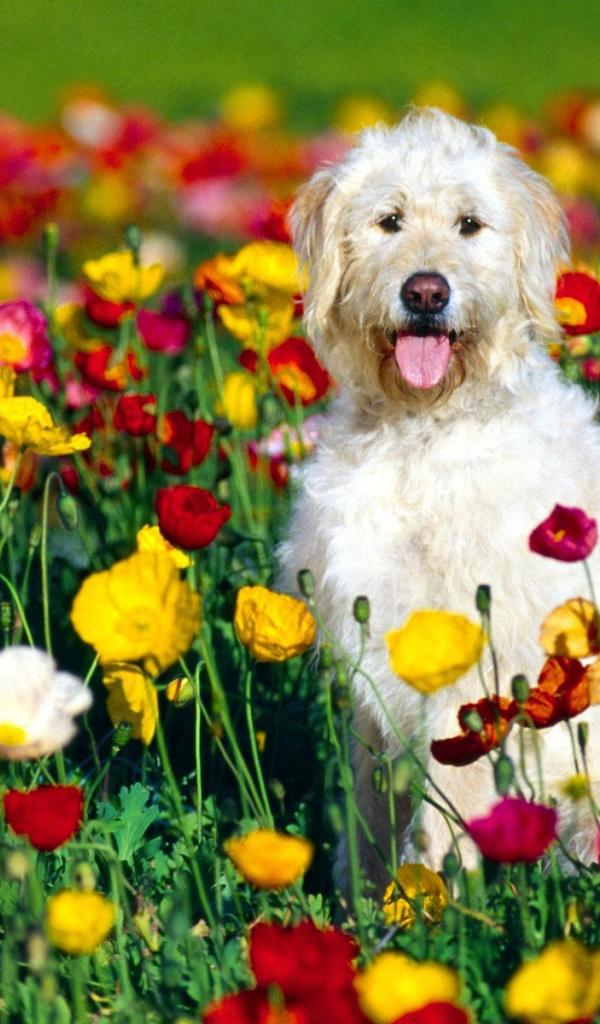 Wallpaper White dog sitting on a bed of flowers