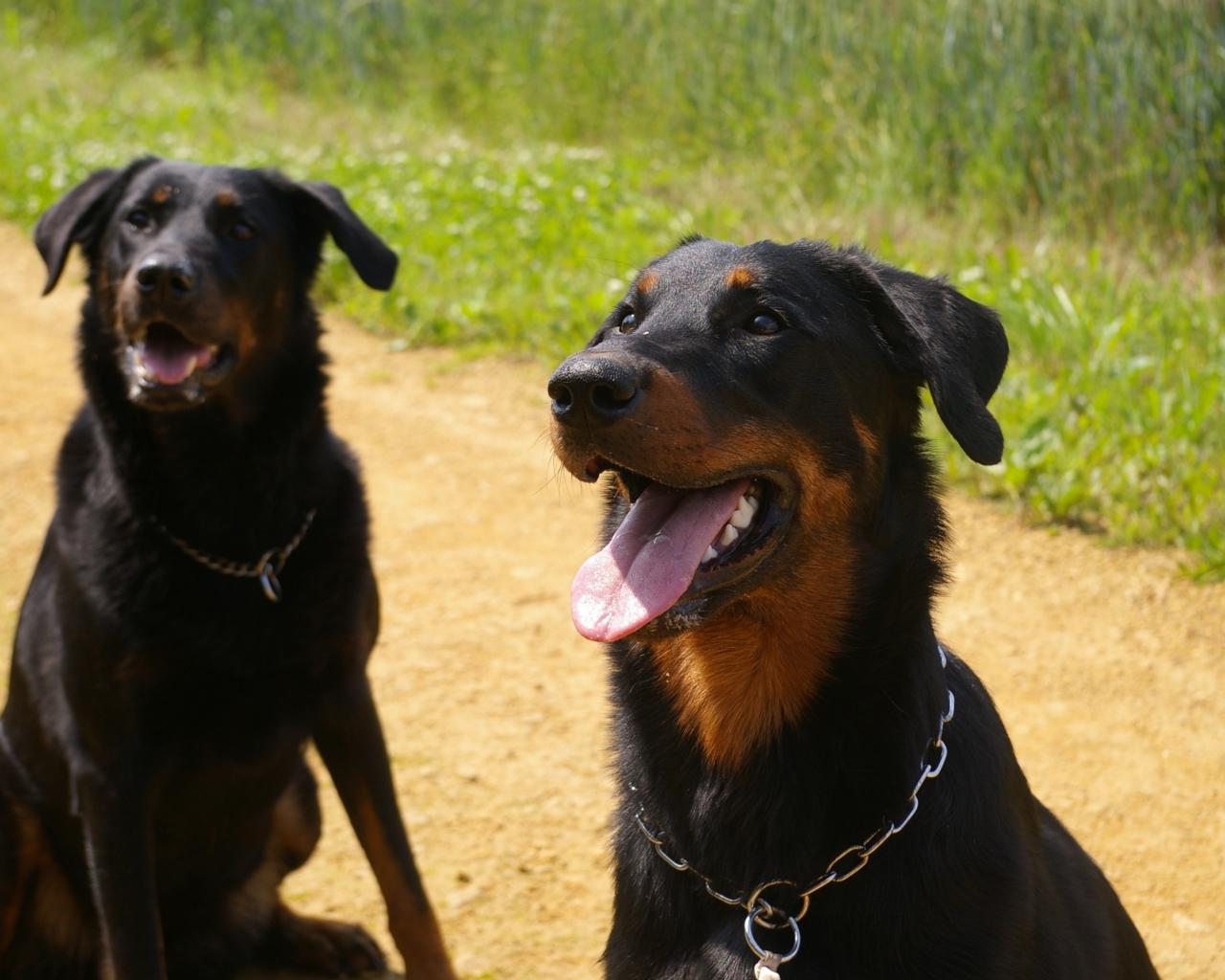 Wallpaper Two dogs of breed Beauceron sitting on the road