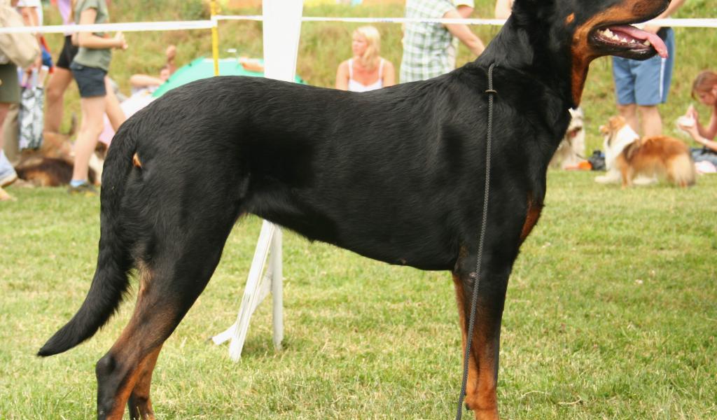 Wallpaper Serious beautiful Beauceron on the background of foliage