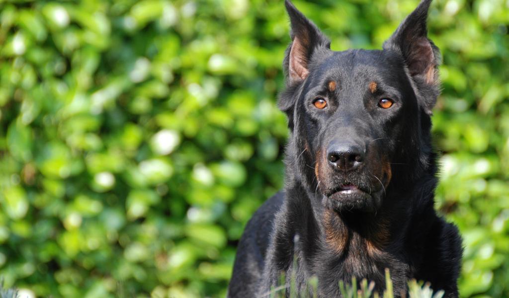 Wallpaper Serious beautiful Beauceron on the background of foliage