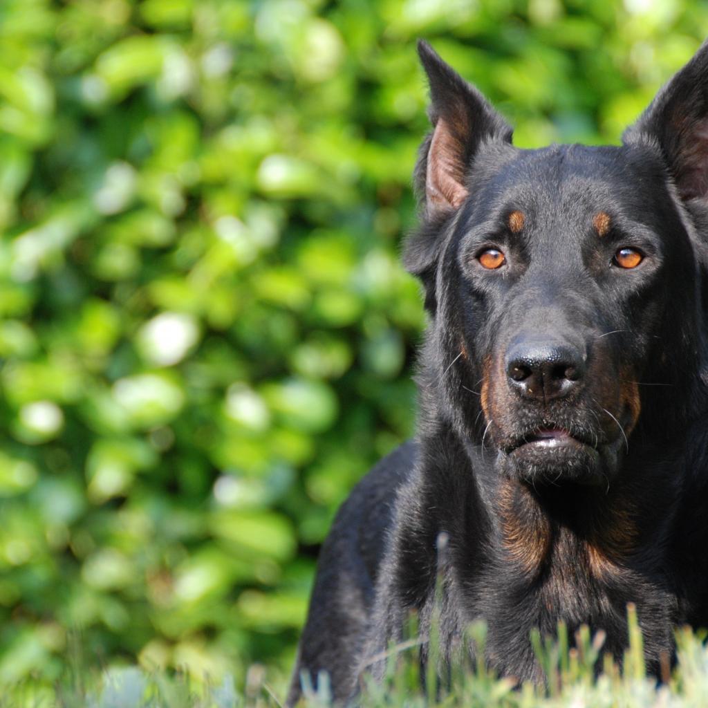 Wallpaper Serious beautiful Beauceron on the background of foliage