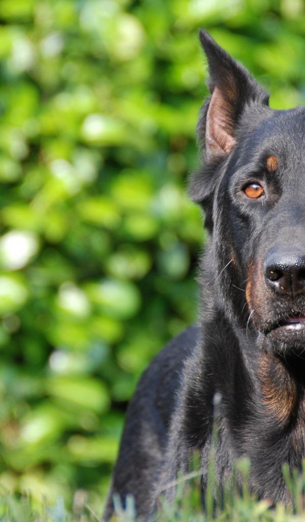 Wallpaper Serious beautiful Beauceron on the background of foliage