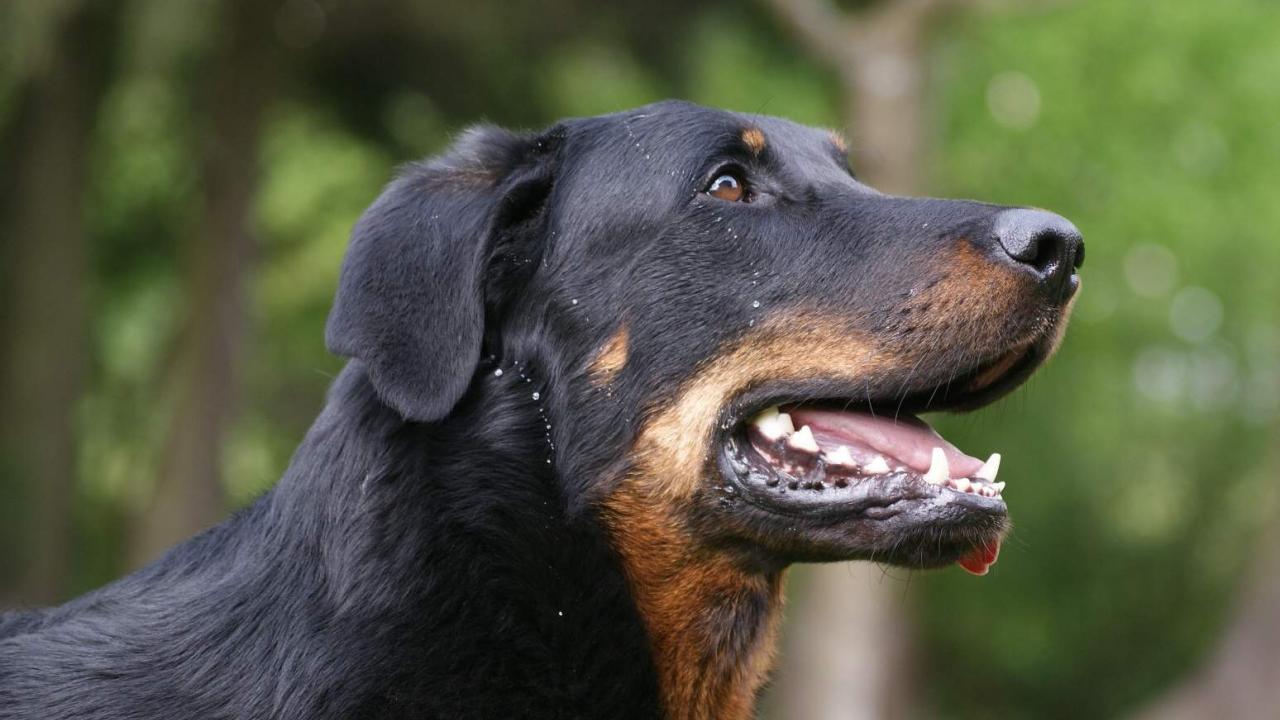 Wallpaper Serious beautiful Beauceron on the background of foliage