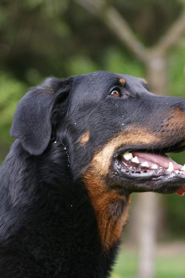 Wallpaper Serious beautiful Beauceron on the background of foliage
